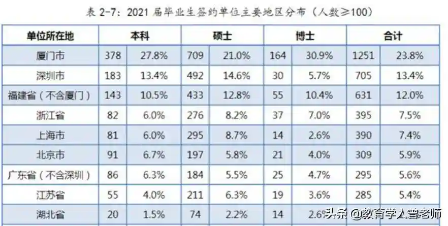 大多数学生去了厦门、深圳市全国重点大学的学生平均升学、参加工作的比率为82.2%。作为全国重点大学的厦大,虽然在毕业生去向落实方面存在某些不足,比如本科毕业生灵活就业率有点高(15%),但是平均93.2%的去向落实百分比远高于全国平均水平。