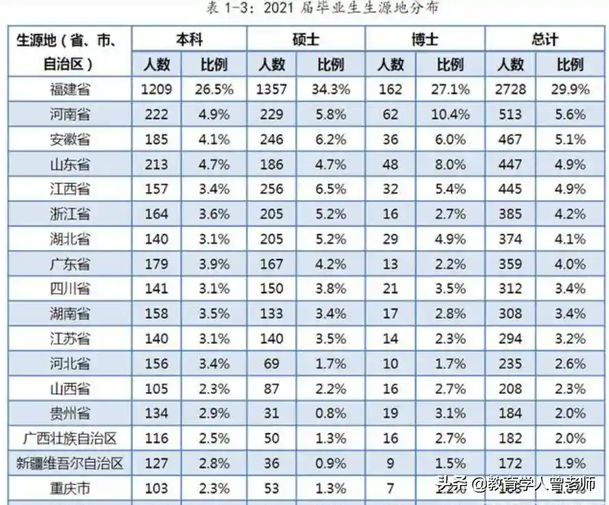 其中本省学生占比29.9%,遥遥领先于第二名河南省的5.6%和第三名安徽省的5.1%。从全国各地在校的学生比例,完全可以看出这所985大学在福建莘莘学子心中的地位有多高。纵观这所名牌大学2026年生源结构和就业去向,可以发现有以下特色: